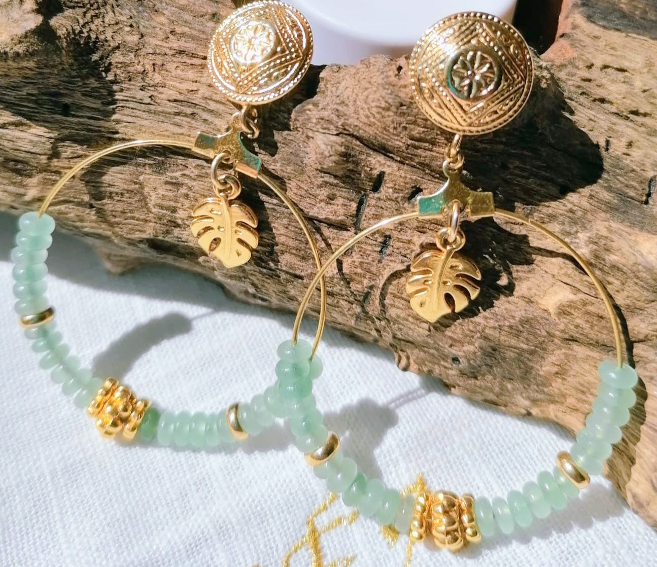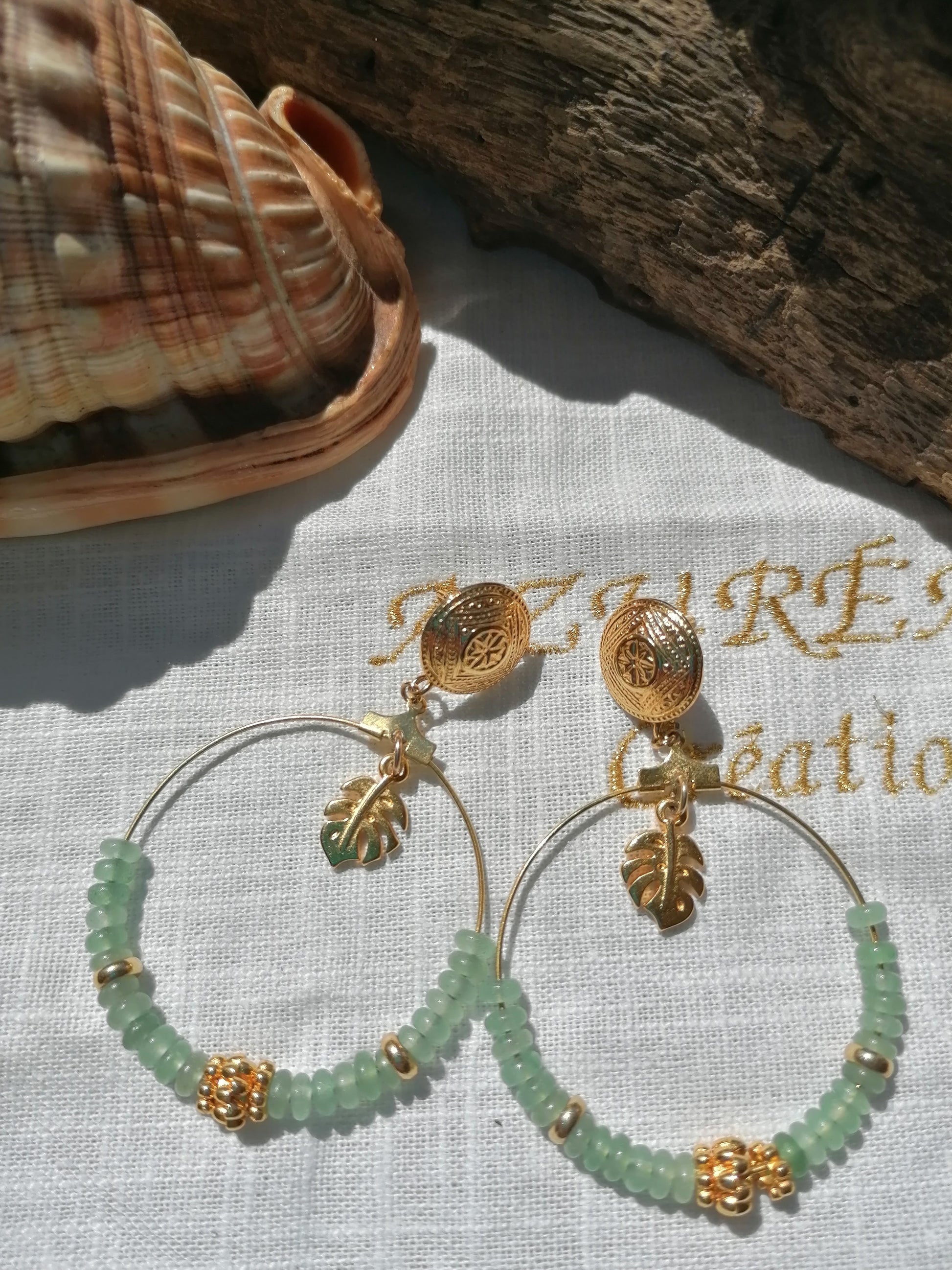 Boucles d'oreille type puce d'oreille sont montées sur une grande créole de 5 cm personnalisées avec des perles aplaties d'amazonite de 4mm et perle dorées décoratives. Un pendentif en forme de feuille de philodendron vient compléter le montage pour une touche exotique.