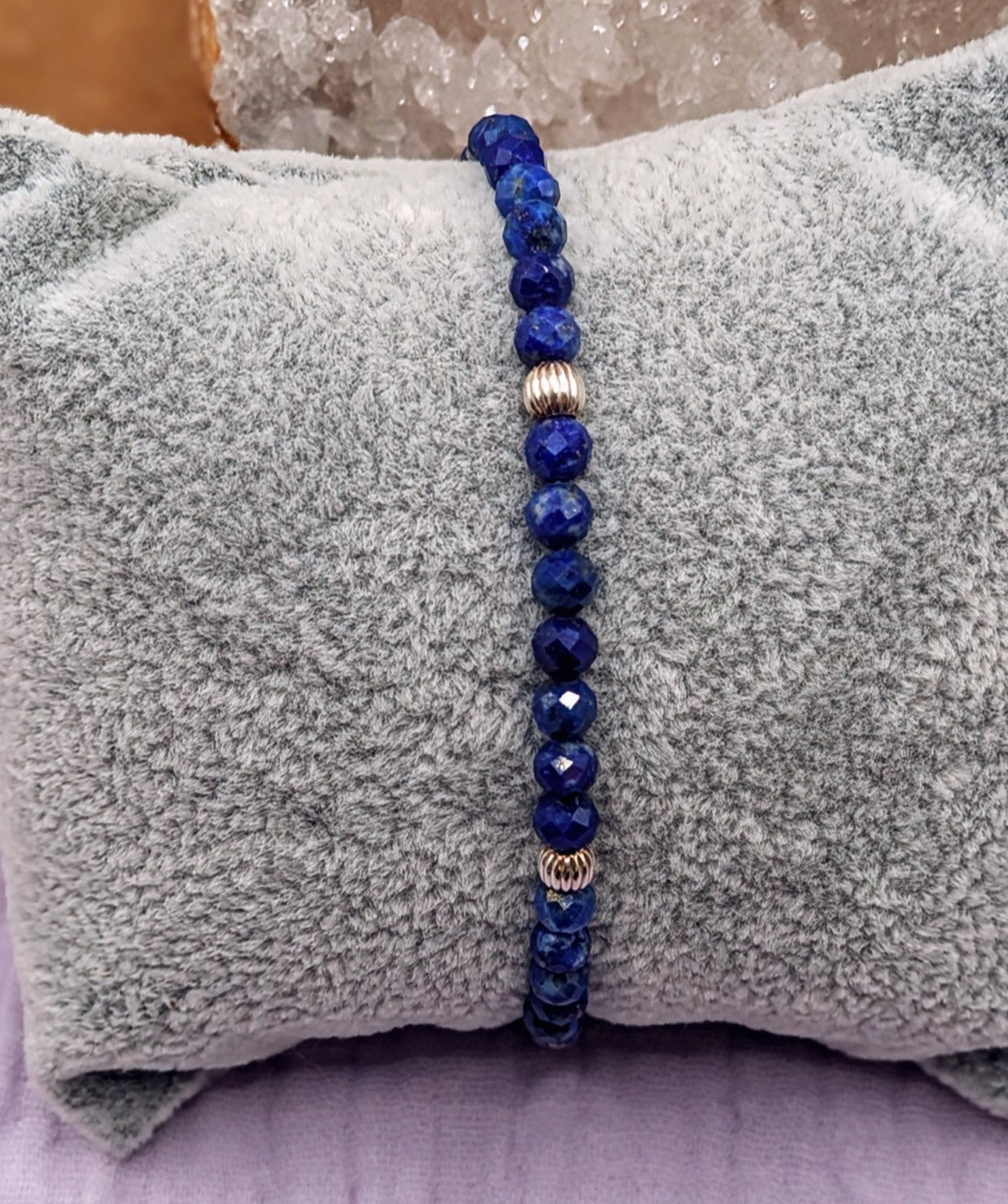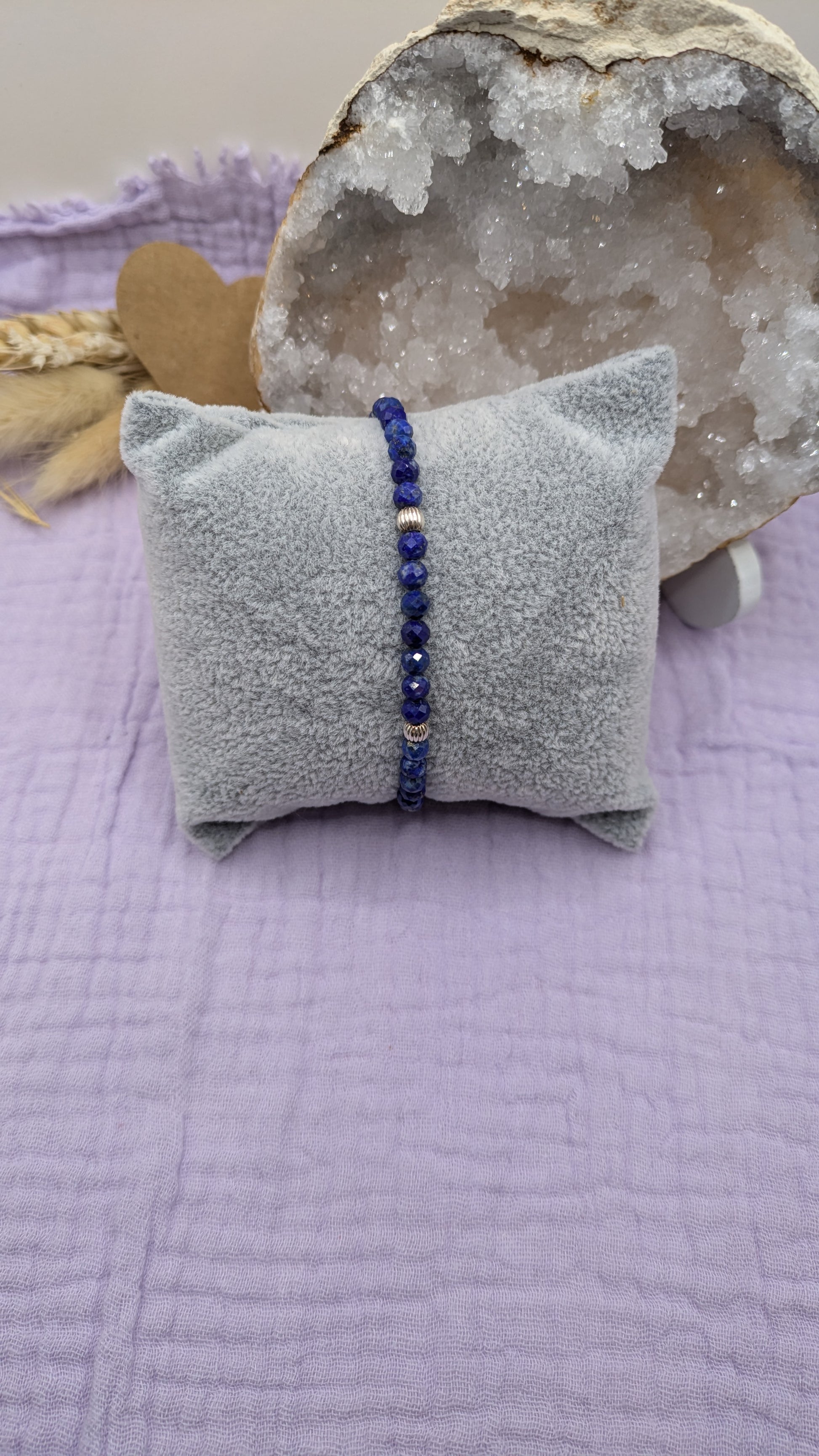 Composé de perles facettées en sodalite de 4 mm et de perles rondes striées, ce bracelet se distingue par ses finitions raffinées en argent 925 et son fermoir à ressort.